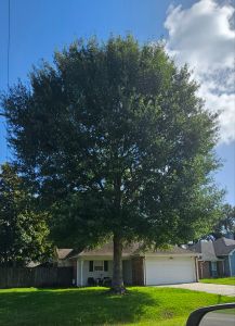 There, in both the front and back yards stand two oak trees, towering over the little house, into the yards of neighbors. Providing shade for the little house well beyond its borders.